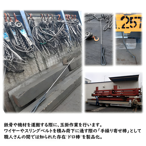 機械の移動・運搬作業、パレット下をスリングベルトを通す際に¨手繰り寄せ棒¨として使用できます。